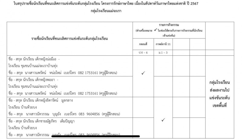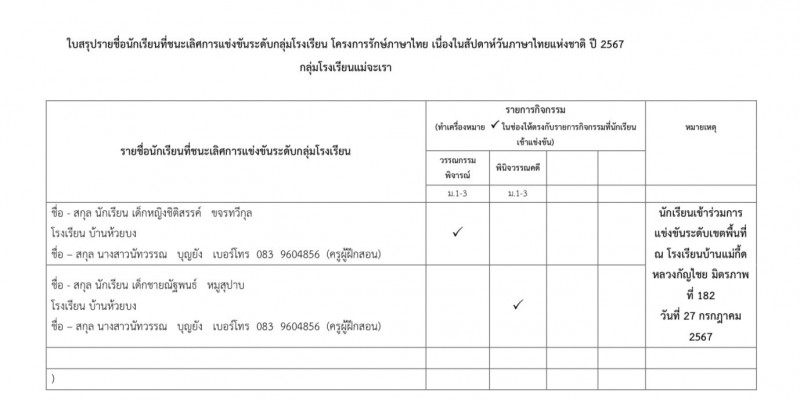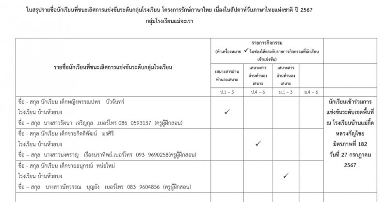 วันอังคารที่ 23 กรกฎาคม 2567 ทางโรงเรียนบ้านห้วยบง ได้นำนักเรียนเข้าร่วมแข่งขันทักษะทางภาษาไทย โครงการรักษ์ภาษาไทย เนื่องในวันภาษาไทยแห่งชาติ ปี2567 ณ โรงเรียนบ้านแม่จะเราสองแคว เพื่อคัดเลือกตัวแทนระดับกลุ่มแม่จะเรา ไปแข่งขันในระดับเขตพื้นที่การศึกษาต่อไป