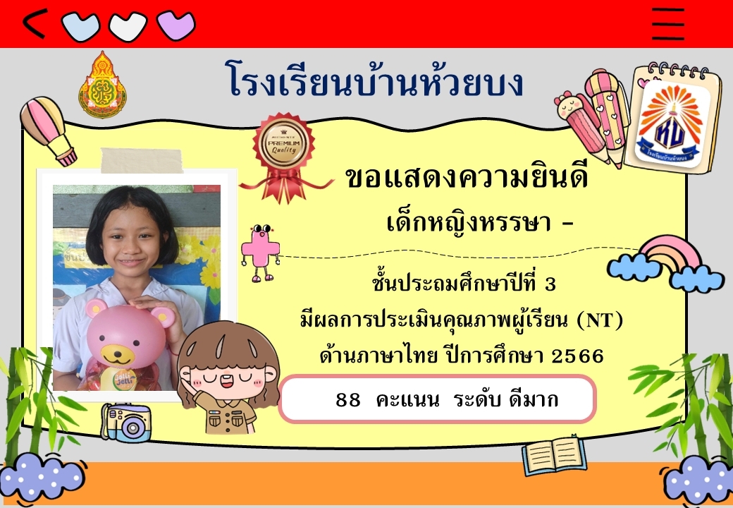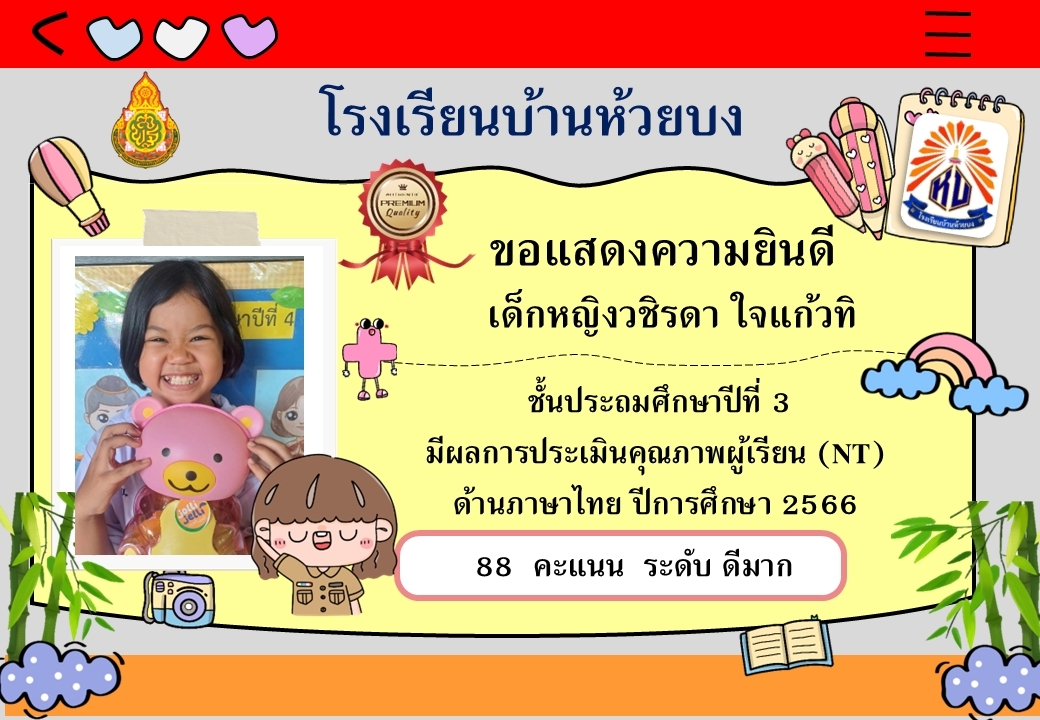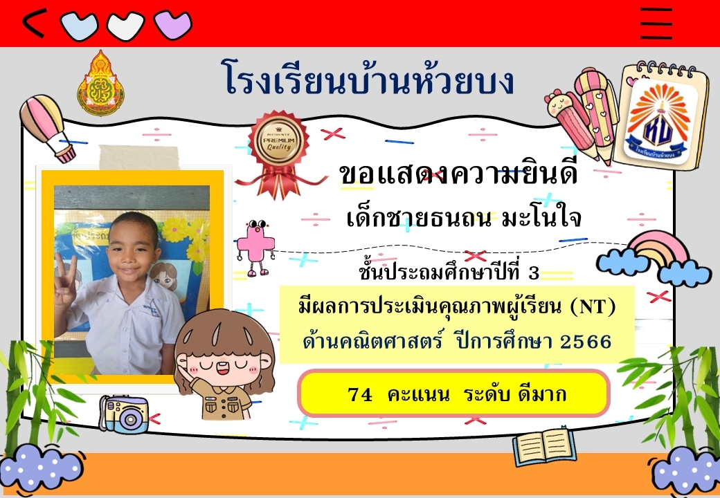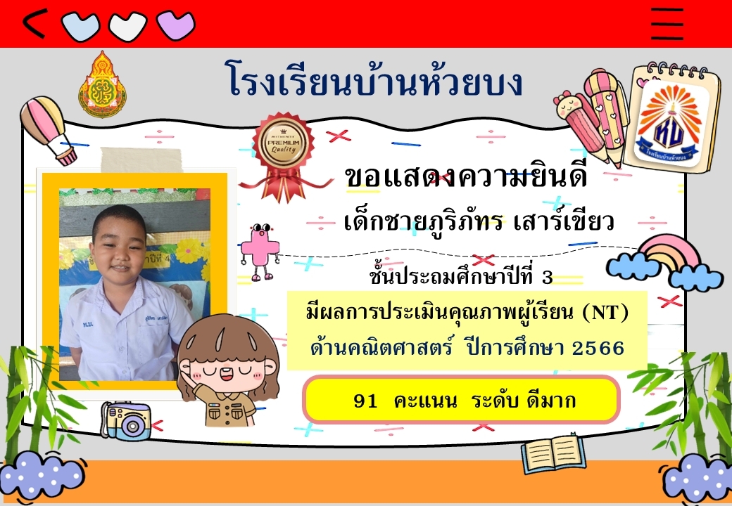 ขอแสดงความยินดีกับนักเรียน ป.3 ปีการศึกษา 2566 ที่มีผลการประเมินคุณภาพ NT ด้านคณิตศาสตร์ และภาษาไทย อยู่ในระดับดีมาก และดี
