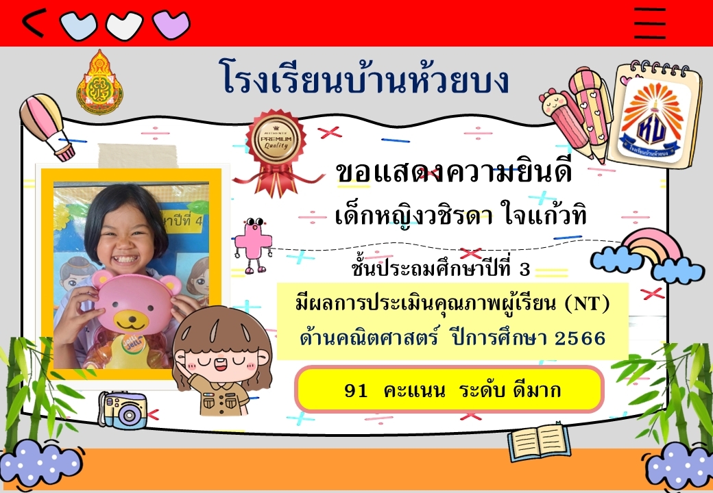 ขอแสดงความยินดีกับนักเรียน ป.3 ที่มีผลการประเมินคุณภาพ NT ด้านคณิตศาสตร์ และภาษาไทย อยู่ในระดับดีมาก และดี |