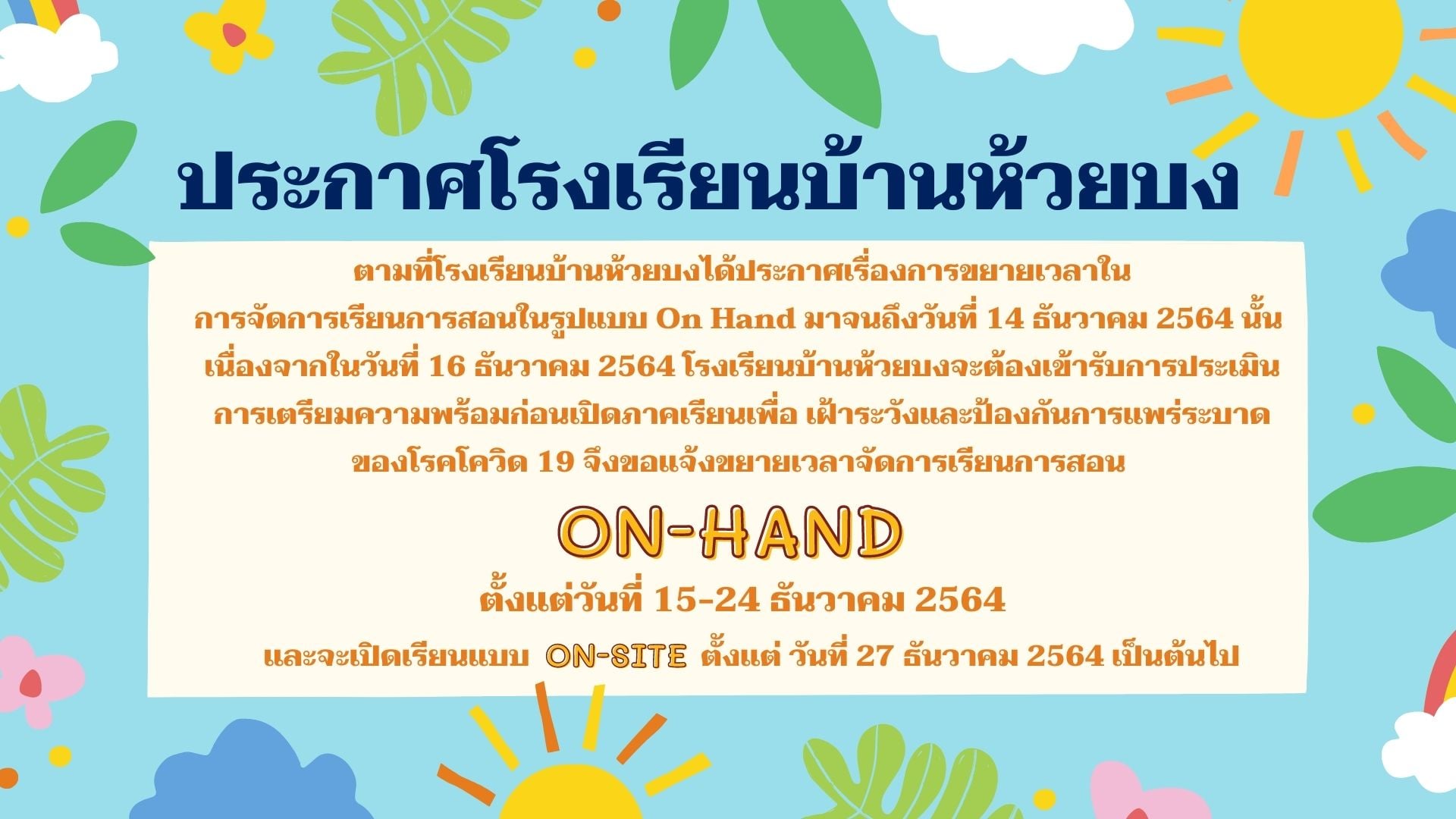 ตามที่โรงเรียนบ้านห้วยบงได้ประกาศเรื่องการขยายเวลาในการจัดการเรียนการสอนในรูปแบบOnHandมาจนถึงวันที่14ธันวาคม2564นั้น